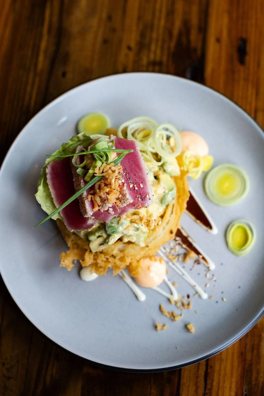 16oz Cut, Black Garlic Steak Fries, Truffle Butter, Horseradish Cream, Tempura Onion Ring